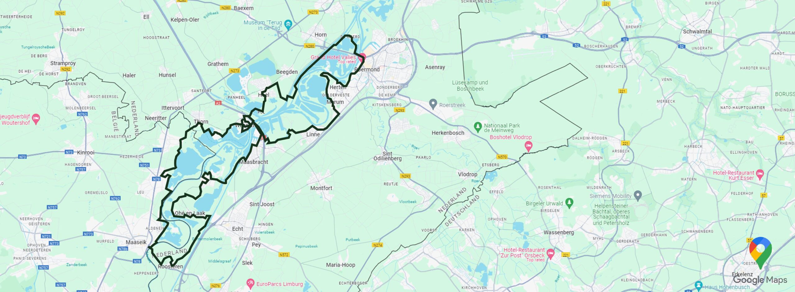 Op deze 71 km lange route kom je door buurland België en langs enkele van de bekende Limburgse Maasdorpjes zoals Thorn en Stevensweert. Ook komt de route door de kop van winkelwalhalla Roermond. Een mooie plek om even van de Eikmond route af te wijken en te genieten van wat de stad Roermond te bieden heeft.