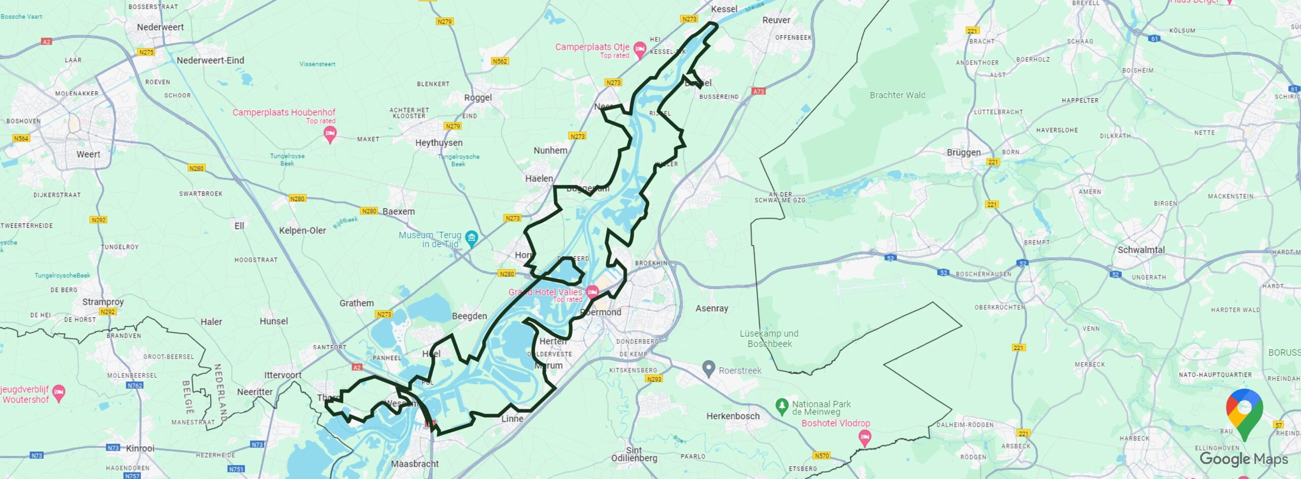 De route vertrekt vanaf Wessem waar we de brug oversteken naar de andere kant van de Maas. Onder de Maas langs rijden we door veel mooie landschappen met voldoende leuke terrasjes en dorpjes om halt te houden voor een korte fotostop of een drankje. We rijden door tot aan Roermond waar je de scooter eventueel kunt stallen om te voet te genieten van wat de binnenstad te bieden heeft. Misschien wil je langs de winkels en de oude pandjes struinen, een blik werpen op het beroemde Designer Outlet of gewoon ergens genieten aan een van de gezellige pleinen.